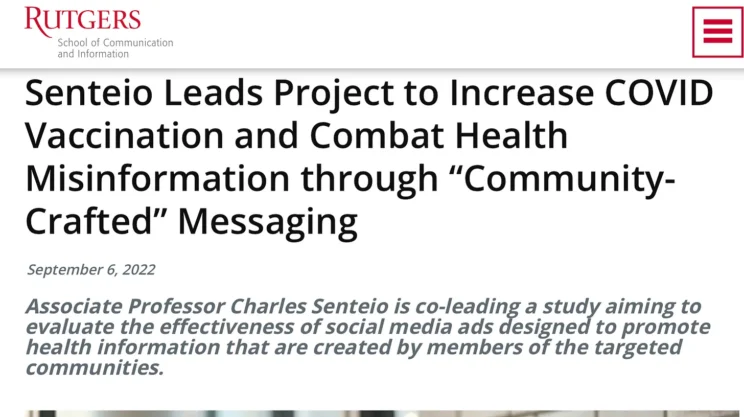Rutgers University is a member of The Mercury Project, a consortium of researchers working to build vaccine demand and support “science-based health decision making.” Specifically, behavioral science-based. Among Mercury Project sponsors are the Bill and Melinda Gates Foundation, the Robert Wood Johnson Foundation and The Rockefeller Foundation. Thanks to funding from the Social Science Research Council (SSRC) Mercury Project, Rutgers is participating in research to apply social and behavioral science “to combat the growing global threat posed by low Covid-19 vaccination rates and public health mis- and disinformation.”