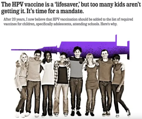 To summarize, a former global medical director for adult vaccines at Merck, who championed vaccines as state epidemiologist and consultant to the State Dept of Health in NJ, who currently provides consultation services “to obtain favorable vaccine policy recommendations” and is on the commercial advisory board of a vaccine company that is making vaccines for cancer…believes it’s time for an HPV vaccine mandate.
