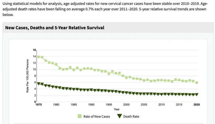 While rates of HPV infection linked to vaccine strains (which is what the vaccines were designed to prevent, NOT cancer) fell after the introduction of the shots, cervical cancer rates in the US “have been stable over 2010-2019”. If you look at the image below, the steady decline in cases over decades actually slowed after the introduction of the vaccine.
